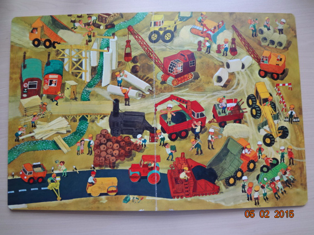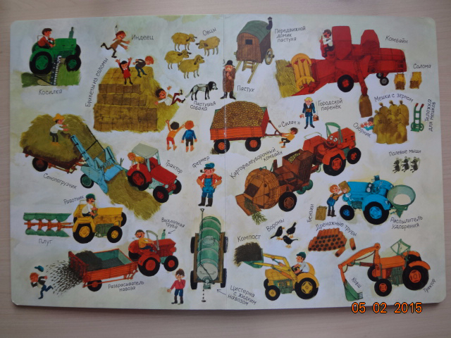 Сейчас конечно "читали" "гляделку" совсем на другом уровне, чем в прошлом году. Андрюша сам придумывал сюжет и комментировал картинки. Здесь можно просто называть спецтехнику, действия персонажей, обсудить времена года, а можно придумать целую историю! В книге есть развороты с картинками и подписями к ним. Вообщем, долгоиграющая книжка для визуалов.