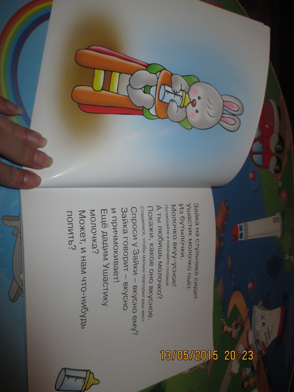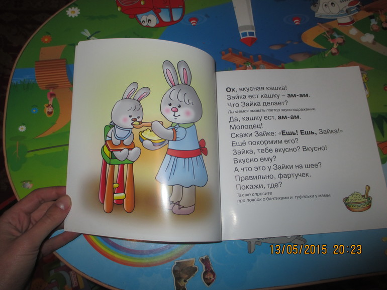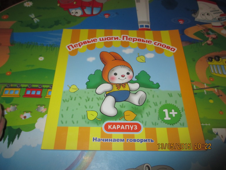 Первые шаги. Первые слова. Сборник из тоненьких книжечек ИД "Карапуз". Приобретала для младшего. У нас есть и несколько отдельных тонких книжиц про этого Зайку, и две "книжки-несказки" в твердом переплете. Старшей они дали хороший толчок к "говорению". Младший у меня, наоборот, "болботун" еще тот, но ему, думаю, не повредит. Обложка плотная, страницы - плотная меловка, мелкий смог только слегка примять.