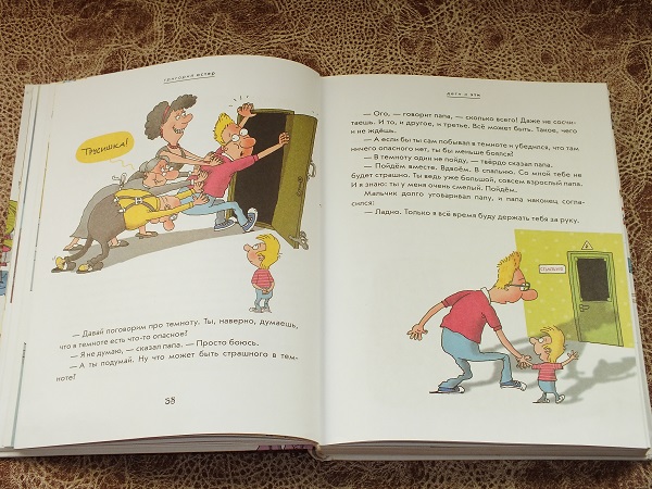 "Моя любимая история про то, как папа боялся темноты. Все говорили: "Иди!". А он: "Не пойду!" А все его толкали. И тогда мальчик пошел с ним вместе. В темноте были глазики, но не только ихние, а ещё бандита. Папа включил свет и перестал бояться. Он взял вот так вот бандита и выкинул в окно".