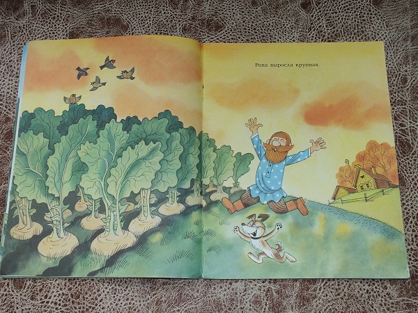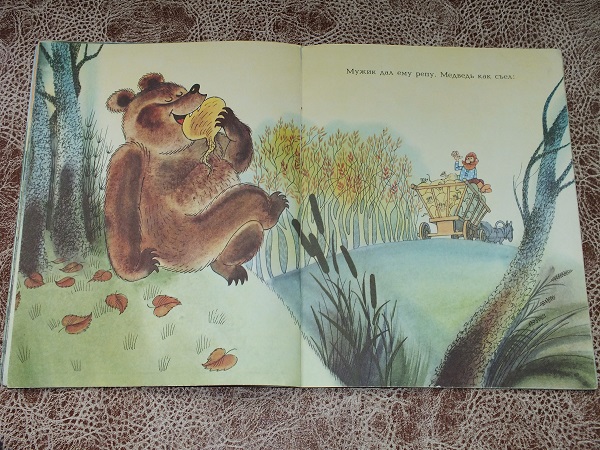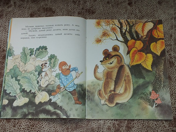 "Мужик сеял репку, а медведь пришел к нему. Мужик, я тебя поломаю. Не ломай меня, медведюшка. Лучше мне корешки, а тебе вершки. "Так и быть", - сказал медведь. Репа выросла. Очень большая. А медведь захотел попробовать, а ему дали вершки. Все засмеялись. Мужик поехал репу продавать, и ему придется в лес поехать. Медведь попросил попробовать репу. У тебя корешки вкусные, теперь не возвращайся в лес по дрова