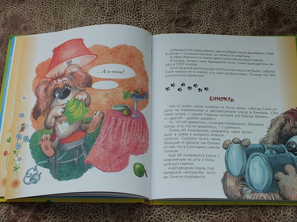 "Это глупая собачка Соня. Она думала, что умная, а дядя думал, что глупая. Но она и правда глупая. Вот тут Соня думала, что эту лужу сделал слон, а на самом деле - дождик. А ещё Соня как-то раз потеряла всё-всё. Она бегала туда-сюда то к входу, то к выходу. А когда пришла давать объявление, оказалось, что она не знает свой адрес. Но самая любимая моя история, когда Соня ловила рыбу в ванне. Ведь там рыбы не бывает! Она очень глупая".