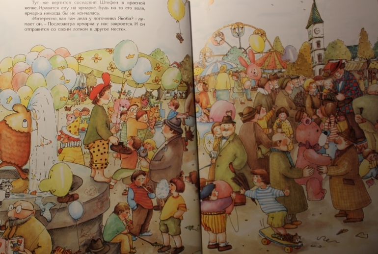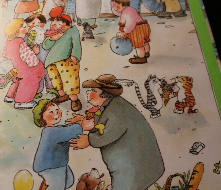 Ничем иным как виммельбухом эту книгу назвать я не могу. На страницах мельтешат одни и те же герои, и текст несет лишь дополнительную нагрузку, основное же действие - на картинках. Главный герой - простоватый обаятельный парнишка в пижамных штанах, еще в фаворитах у моей дочки толстые полосатые коты и пронырливые мыши. Рассматривает понравившиеся моменты по сотне раз, очень смеется. Я должна послушно вместе с ней искать мышек, и естественно, упаси меня Бог, находить их первой.