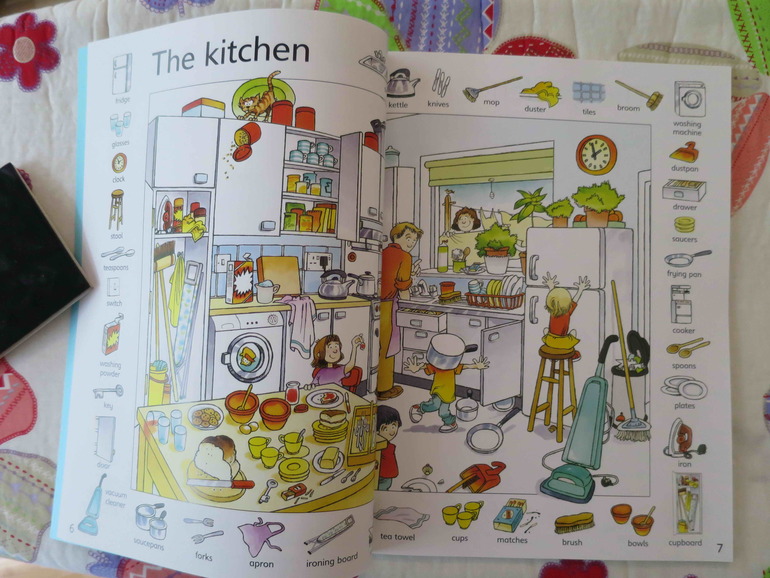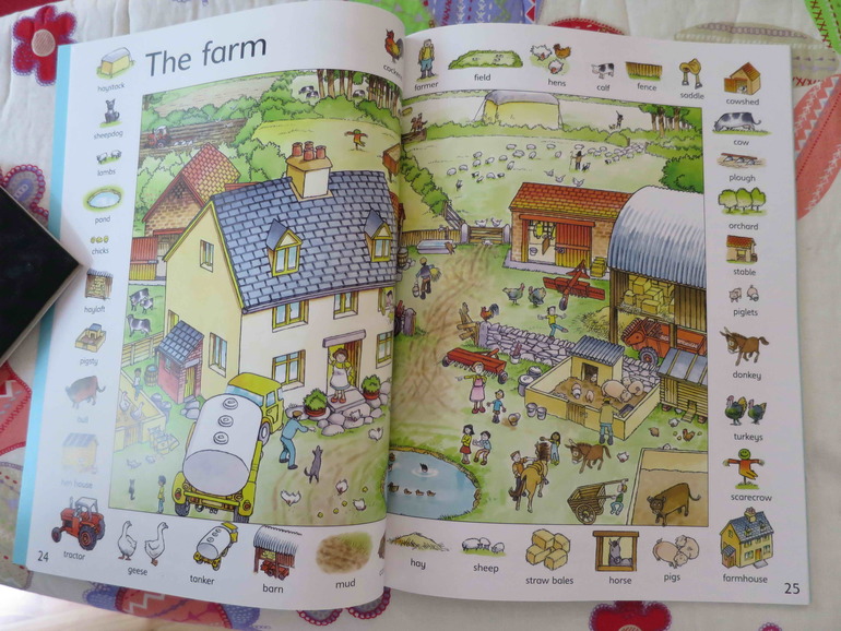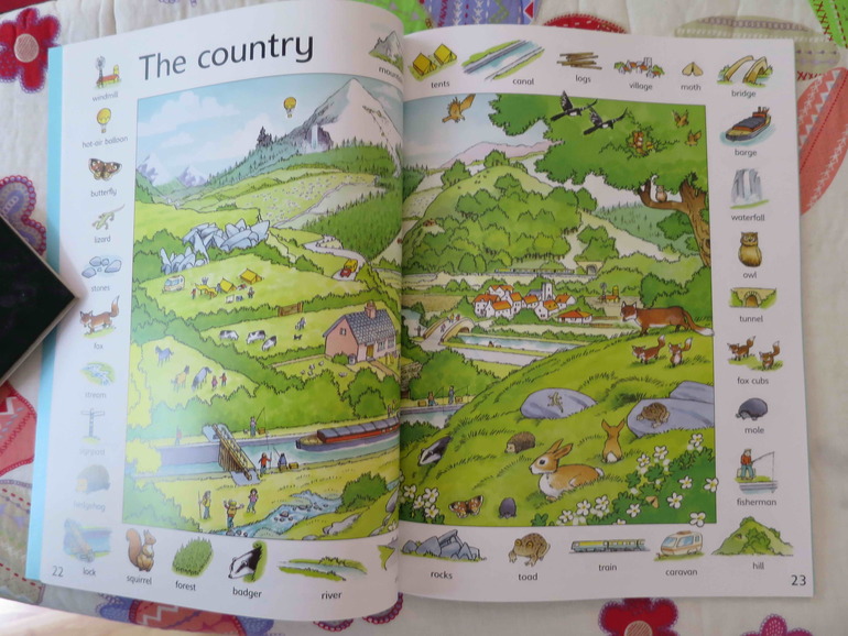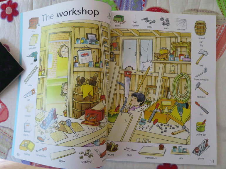 Много разворотов - находилок! Большая картинка на весь разворот или 3-4 небольших, на поля вынесены слова, которые надо на них найти. Систематизированы по темам, например: дом, сад, мастерская, в городе, транспорт, в деревне и т.д..