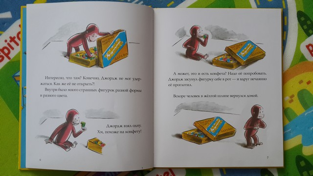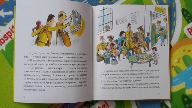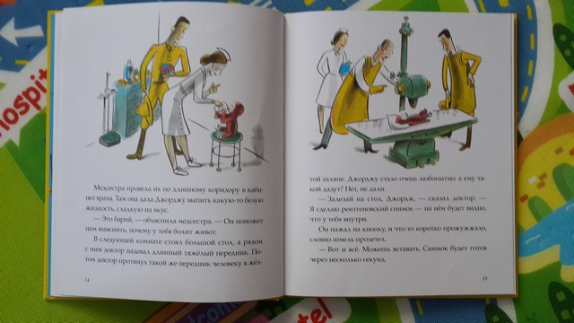 На самом деле есть целая серия про Любопытного Джорджа. Начинала с этой книги, потому как дочка около года бредила темой врачей и всем, что с ними связано. И мой выбор не разочаровал ни ребёнка, ни меня. Книга замечательная, простой слог, интересные приключения. Ненавязчиво рассказывается про такие понятия как рентген, переливание крови, наркоз и прочее. То есть кроме того, как почитать, тут есть и что обсудить. Иллюстрации "как я люблю" - качественная картинка и много белого фона :)