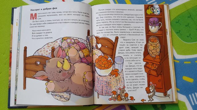 Это любимая дочкина сказка про носорога, который ел в кровати печеньки и из-за этого плохо спал ночью, - ему было щекотно)