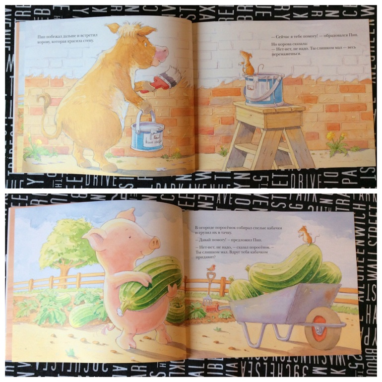 У нас "Кролик" (несколько сомнительная мораль в том, что он капризничает, подвергает себя опасности на краю ванны, а ему заново ванну наполнили, всех и все бросили и носятся с ним одним. Есть опасение, что многие дети могут решить, что так и надо. Стараюсь на этом при чтении не акцентировать) и "Утиная каша" (эта книжка нам обоим очень нравится, к ней никаких претензий нет). Остальное покупать не планирую, так как в нашем случае это будет довольно одноразово, в отличие от того же Фирдуса. Но книжки конечно сделаны хорошо.