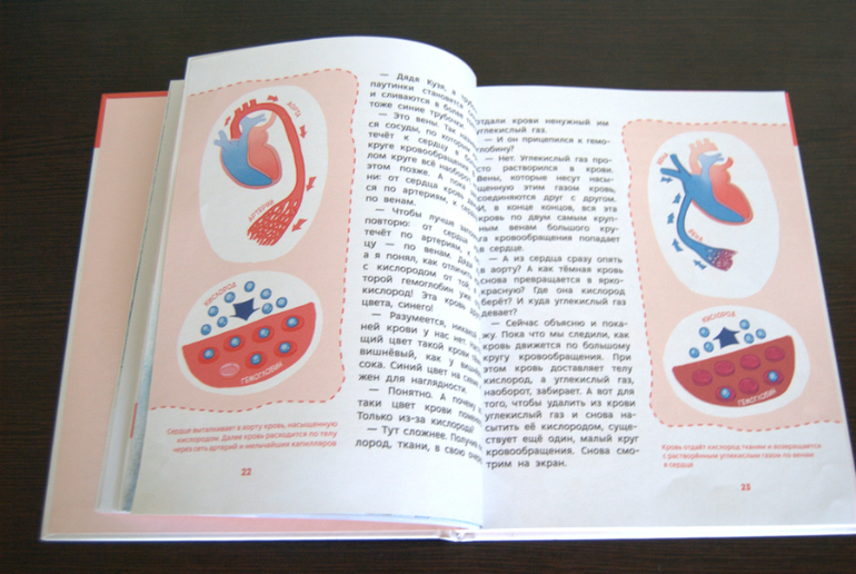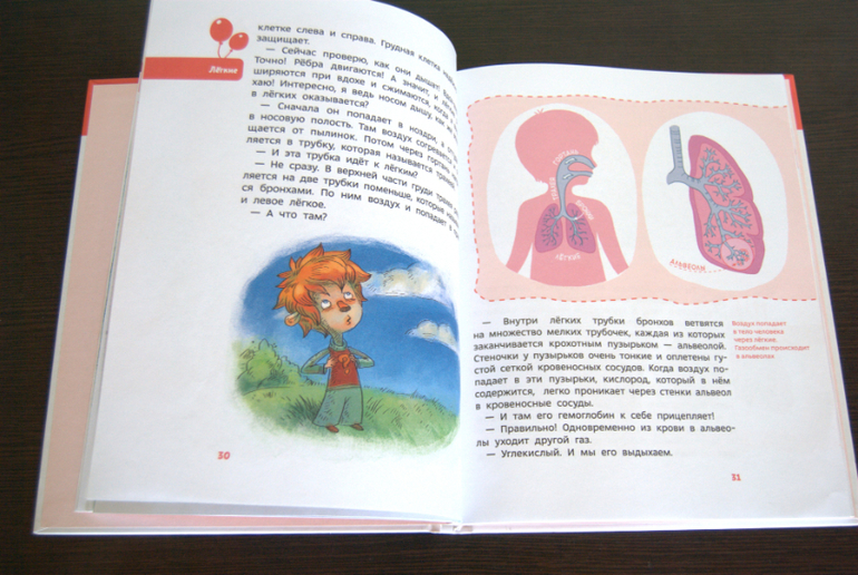 Про строение человека мы читали уже несколько раз, дочери 5 лет и она прекрасно понимает все о чем рассказывается и показывается в книге. Разве что картинка глаза пока еще не совсем укладывается в ее голове, как это все переворачивается и видится. Но огромнейшим плюсом мне видятся рассказы и пользе правильного питания, физических нагрузок, о вреде курения. Мы часто говорим своим детям, что курить очень плохо и вредно, так как существуют курящие родственники и вообще масса окружающих с сигаретой в руке, так теперь дочь сама рассказывает всем тем родственникам именно почему это вредно, и какие страшные у них теперь легкие :)
