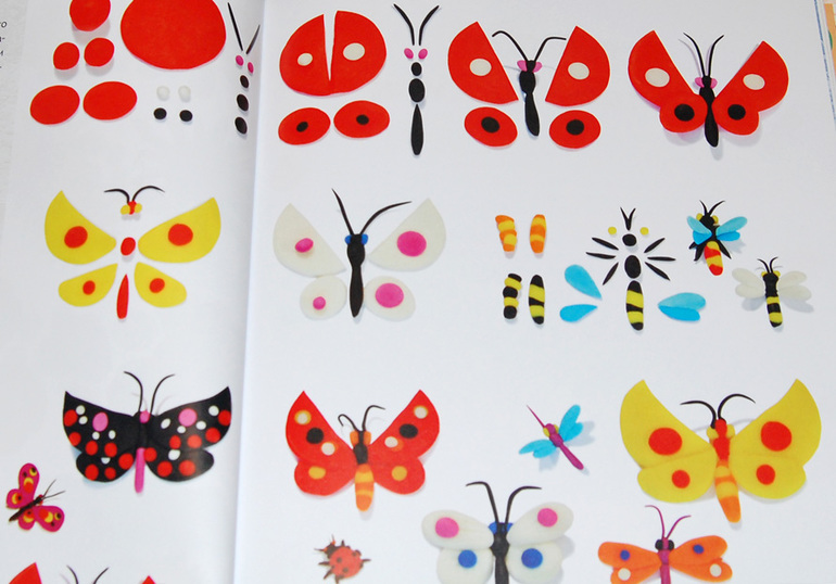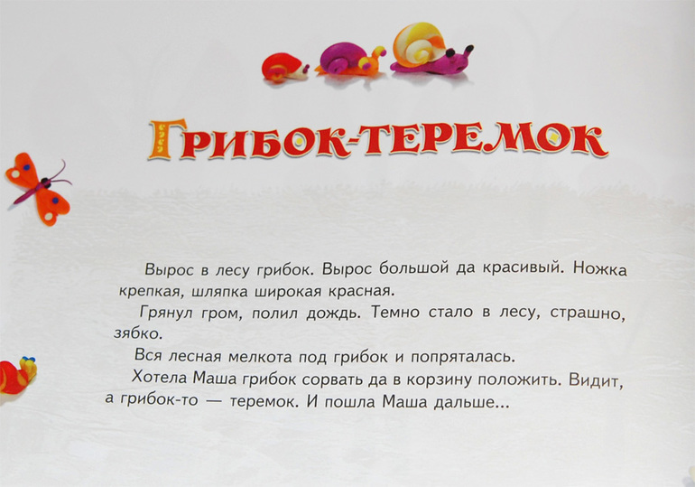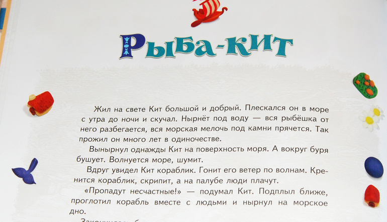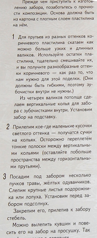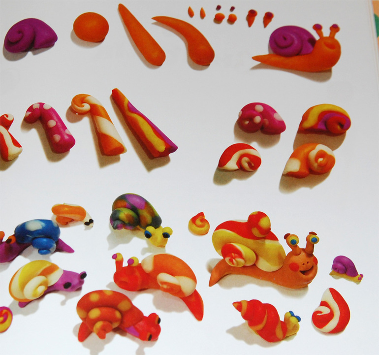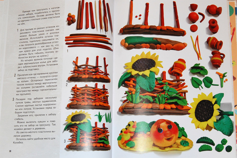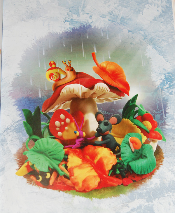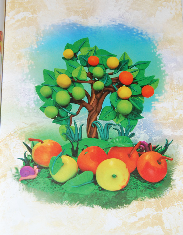 Картины достаточно сложного уровня, выглядят классно, хочется сделать. Но не обязательно лепить всю картинку. Туториал растянут на несколько страниц, легко можно выбрать один понравившийся персонаж или деталь интерьера и слепить только их, также можно подобрать свои варианты кого с кем сочетать из разных сказок-тем. Причем персонаж на картине может быть один, например улитка, а тебе покажут как ты можешь его по-разному оформить, см. фото. Сказки как классические - колобок, три поросенка, так и собирательные - яблонька, рыба-кит. Текст в этой книге явно не главное. Хотя приятно как всё оформлено и это не просто украшения а то, что ты можешь сделать сам. От форзаца то выходных данных, сплошная пластилиновая феерия. Книгой довольна. Вручаю её папе, они листают книгу, выбирают персонажа и сопят вдвоем над коробкой пластилина. Папа наш говорит: ни за что бы сам такое не придумал, а так у него получается, сам удивляется!