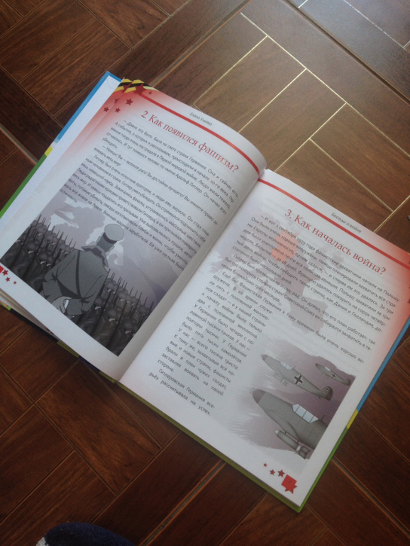 познавательные книги, энциклопедииСыну 5.5, очень впечатлился реакцией бабушки - ветерана, которой на 9 мая подарил открытку...бабуля и плакала улыбаясь и тысячу раз поцеловала его. После этого сын долго спрашивал: " А с кем бабуля воевала?", "а фашисты плохие? А где они жили? А все немцы фашисты?" И еще мильон вопросов. Сейчас читаем книгу.