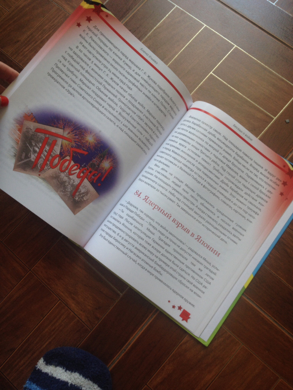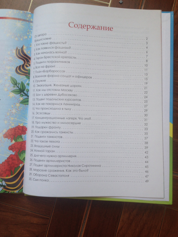 Что понравилось: книга реально написана для дошколят, в ней простым языком изложена последовательность событий, охвачено много разных тем и кто такие артиллеристы, и пехота, и про самолеты и танки, какое оружие использовалось, о маленьких и больших героях, о партизанах, о мужестве и подвиге, и даже про ядерный взрыв в Японии. Очень рекомендую деткам, которые задают вопросы. Ответов в этой книге много.