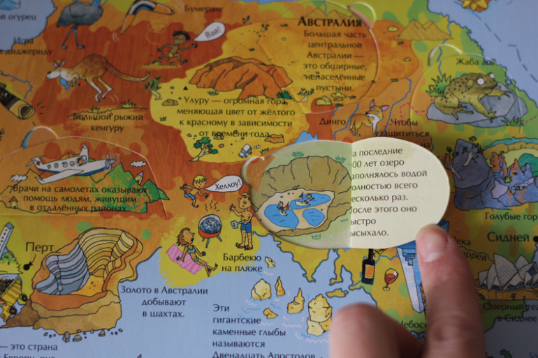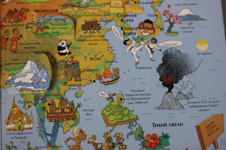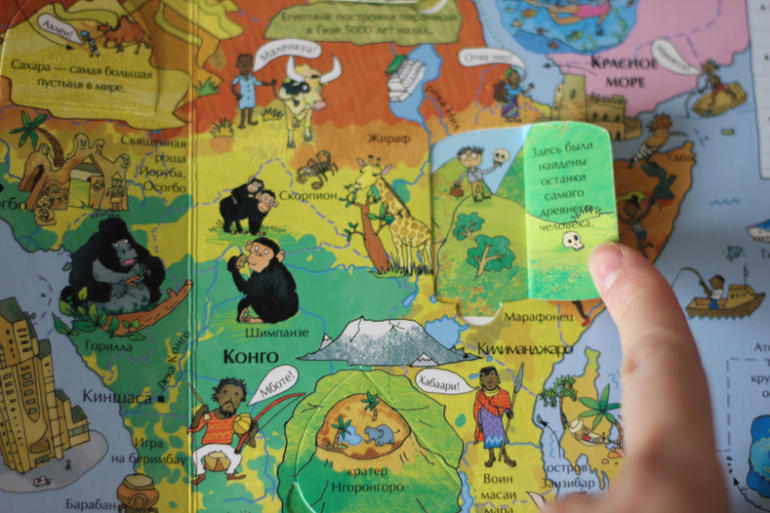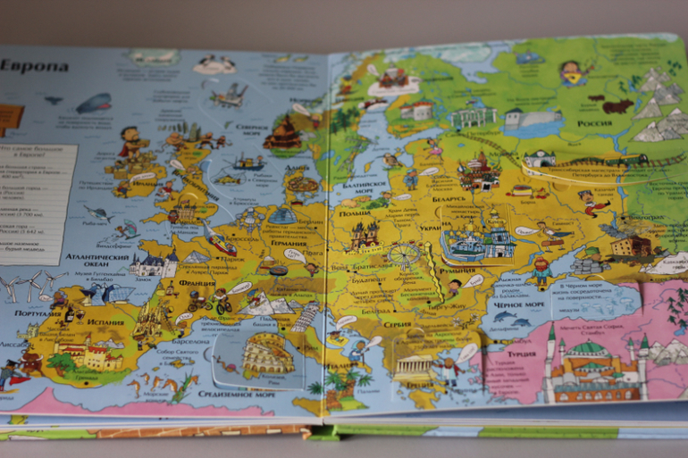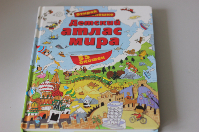 Отличная книга, очень увлекательно рассматривать карты и открывать окошечки. Много интересной информации. Плотный ламинированный картон. Один из самых лучших атласов для малышей, если не САМЫЙ лучший.