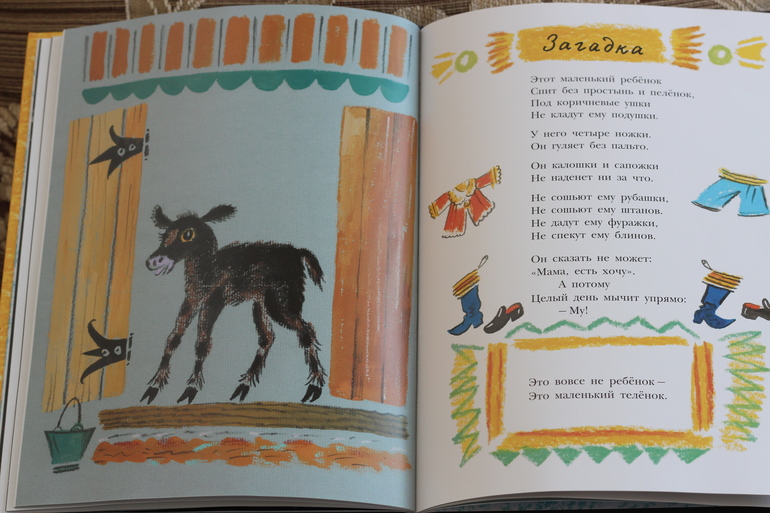 Корову мой ребенок видел и слышал у бабушки в деревне - через забор из сетки-рабицы. И видимо, она произвела на него огромное впечатление. Хотя она на кого угодно бы произвела впечатление своим пыхтением, носом тычащимся в забор и громким мычанием. Из-за этой коровы и теленка мы полюбили этот сборник и очень-очень часто его читаем.