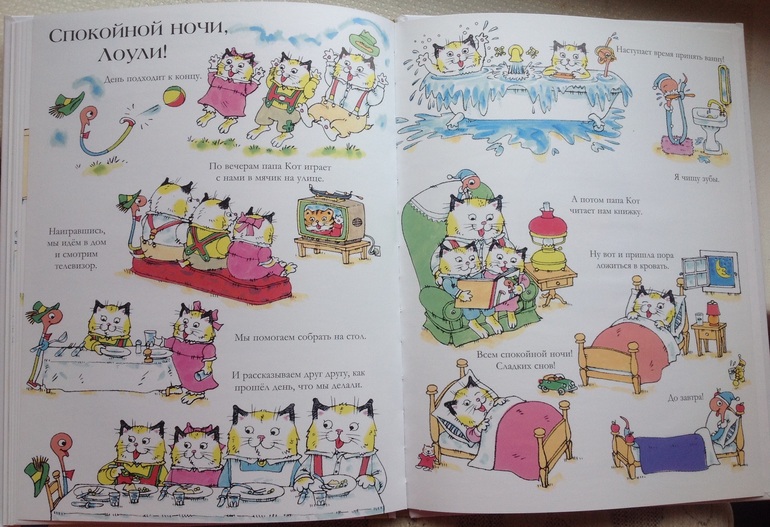 На первом развороте Лоули рассказывает о начале своего дня и знакомит нас со своей семьей - мамой Кошкой, папой Котом, братом Хакли и сестрой Салли(тоже кошками). Лоули совсем не похож на своих родных, что не мешает им всем быть дружной семьей)