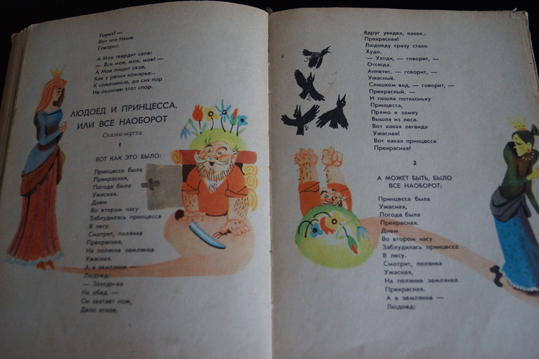Настоящее сокровище. Конечно в детстве я этого не понимала, я просто любила ее, обожала листать и разглядывать картинки. Вот мой любимый разворот. Сапгир "Людоед и принцесса". Ну какая девочка не любит принцесс.