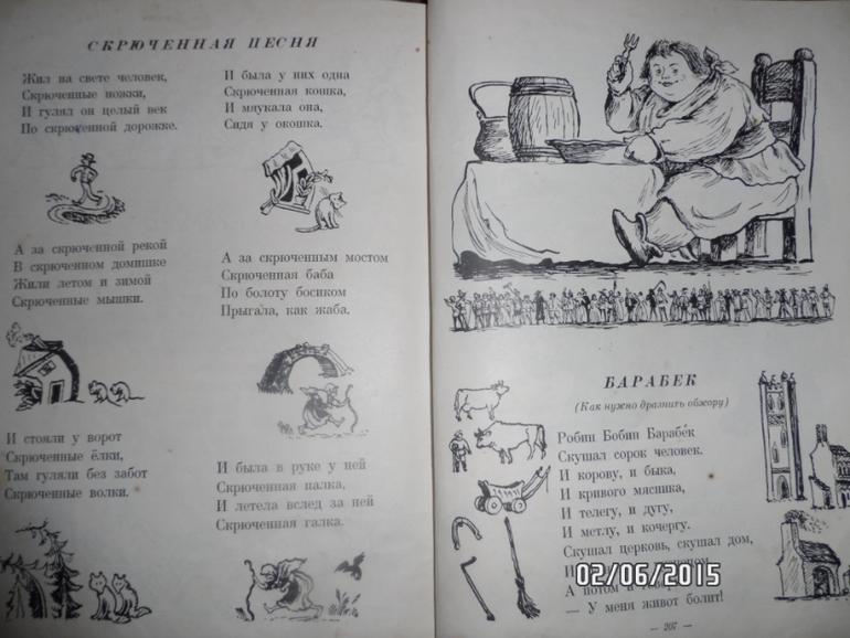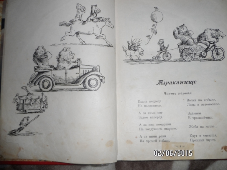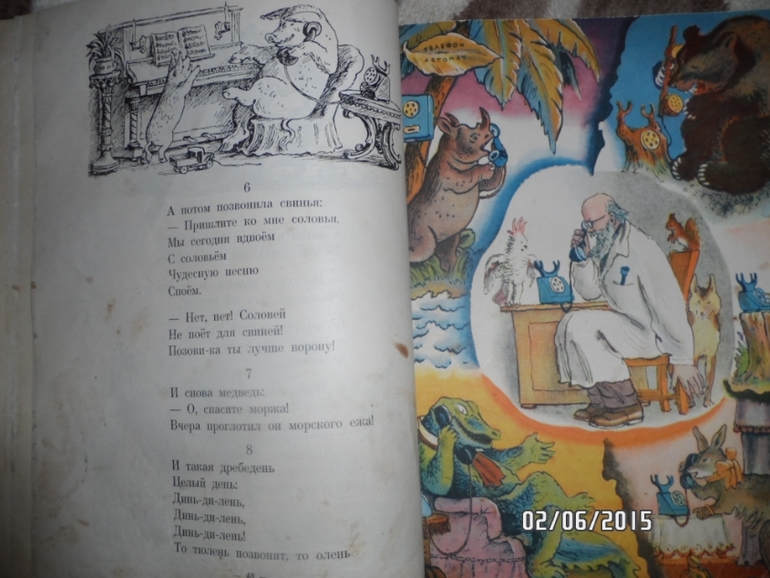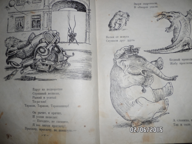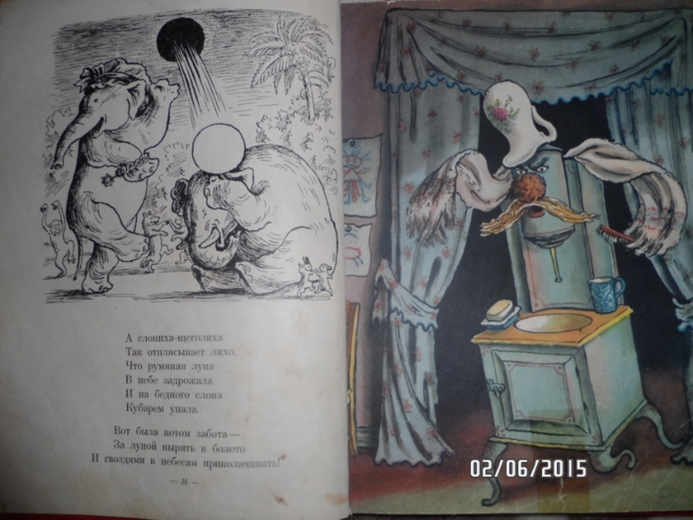 книга досталась мне в наследство от папы. Я залюбила эту книгу и бабушке пришлось отнести ее на новый переплет так сказать. В книге иллюстрации чб, есть цветные вставки. Она уже совсем старенькая, страницы переклеенные, но эта книга для меня самая детская, самая любимая, самая самая. Мама рассказывала, что мне было около года и я утром вставала и бегом к книжному шкафу за Чуковским. В 1,2 сама рассказывала Цокотуху, жаль мои дети пошли не в меня)))хотя оба любят кровожадные стихи про Крокодила и Ваню Васильчикова, Айболита, Бармалея)))