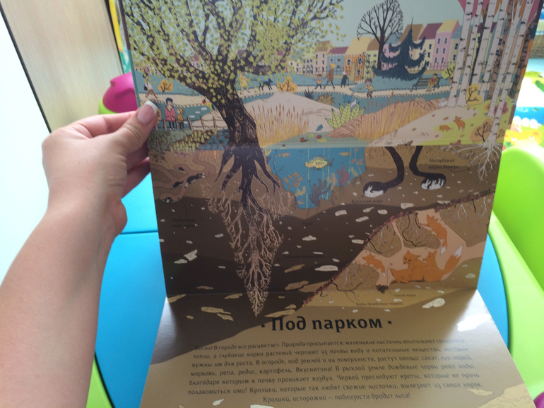 Качество очень хорошее, плотные странички, безумно интересно изучать жизнь под парком, магазином и т.д. Сама зависла над ней на минут 30 точно))) Еще в книге есть окошки