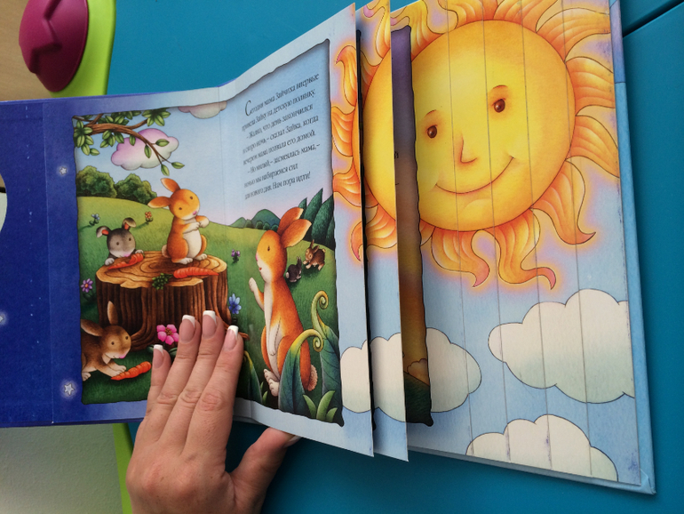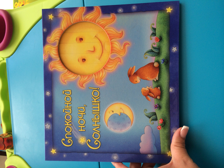 Очень понравилась сыночку. Картонные странички, приятные нежные иллюстрации, интересная задумка - когда перелистываешь последнюю страничку получается ночь, луна, звездочки...