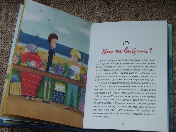 В первый день, когда мы приехали, мама сказала: "Куплю тебе три игрушки, и больше не проси". И как же выбрать всего-то три игрушечки из целой аллеи? Пока мы шли к морю, я хотела купить резинового слона, жабу и тиранозавра. Когда мы шли обратно, я мечтала о липком пауке, мягком коте и фиолетовом драконе. Как же трудно выбрать!"