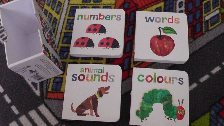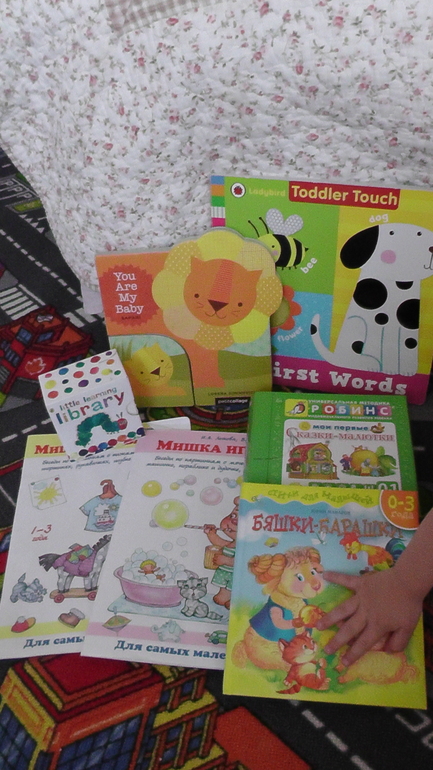 Мини-книжки от Карла.Я не его фанат, но рисунки неплохие, 4 темы у книг-цифры, цвета, простые слова и звуки животных.Льву очень нравится еще и коробка))