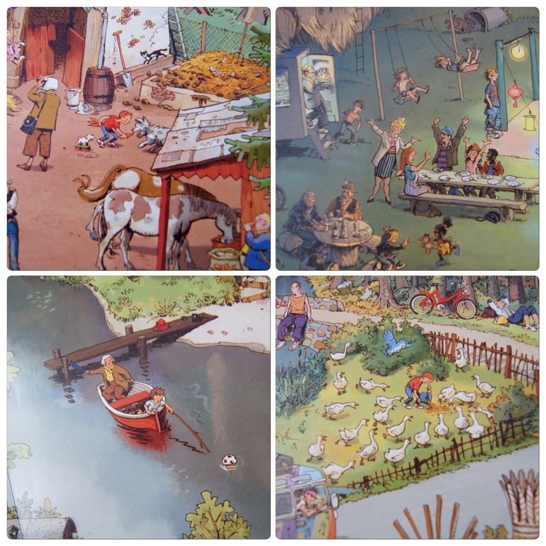 Действие в книге происходит за городом (очевидно из названия), именно поэтому там есть и тракторы, и экскаватор, и велосипеды, и грузовичок, перевозящий кудахчущих куриц в клетке, и загоны с хрюшками, лошадьми, коровами... Да даже пасека с пчелами попала в кадр :)