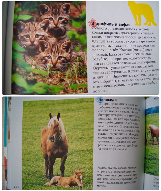 Что удивительно, так это то, что самый неинтересный пока что разворот - про мам и их детенышей. Еще удивительнее, что при этом одна из любимых книг - энциклопедия, о которой речь ниже.