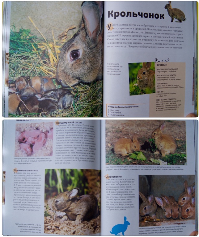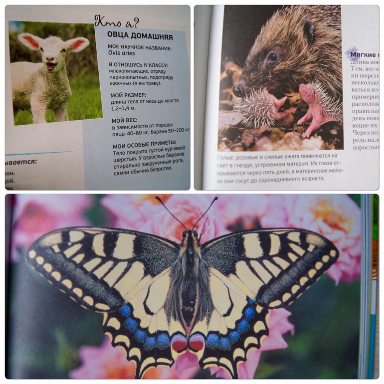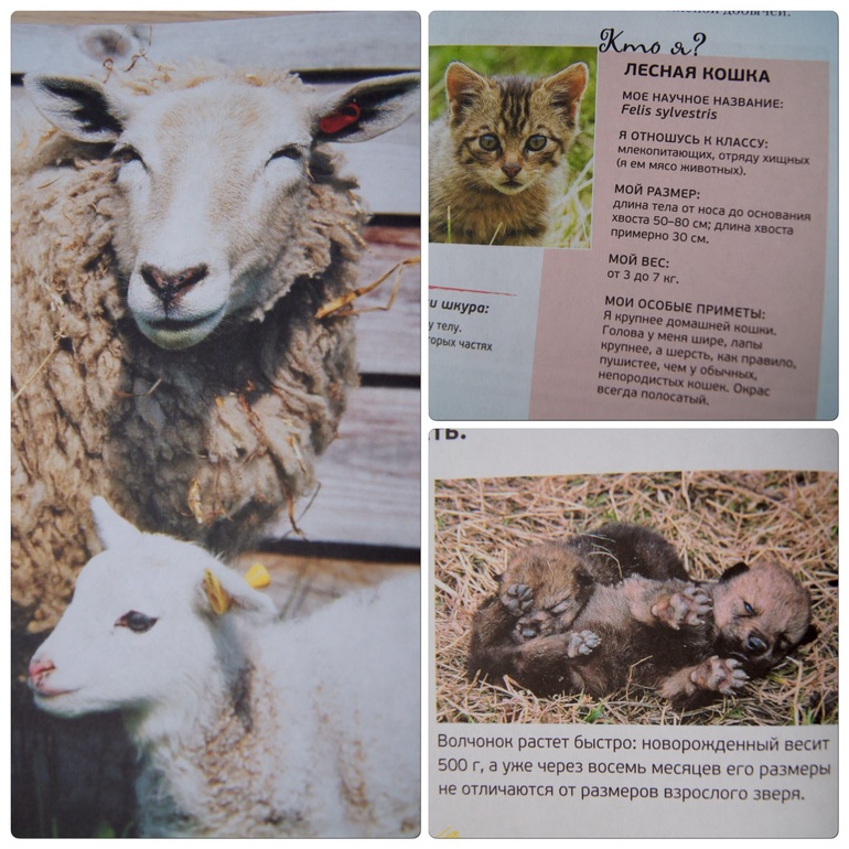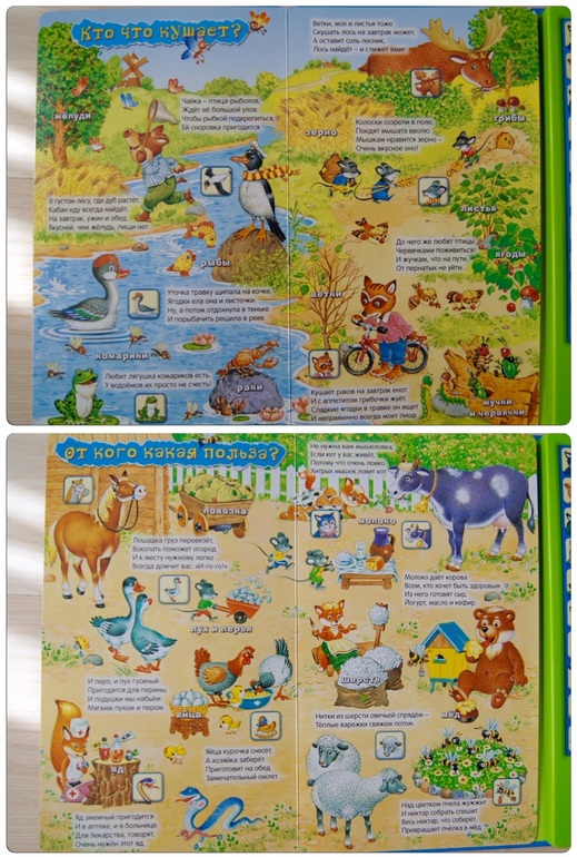 Другие развороты тоже интересные: "Чей домик в лесу?" - о жителях леса; "Чей домик особенный?" - о жителях реки и прибрежной зоны; "Кто откуда появился?" - о том, кто как родился на свет - кто из яйца, кто из маминого животика; "Ищем деток во дворе" - о животных и их детишках; "Ищем деток в лесу" - аналогично предыдущему; "Кто что кушает?" - понятно из названия; "От кого какая польза?" - корова дает молоко, овца - шерсть, пчелы - мед и т.д.; "Как мы защищаемся?" - различные звери, у которых есть свои особенные способы защиты - дикобраз и его иголки, скунс и его запах, броненосец и его кожа-броня и т.д.