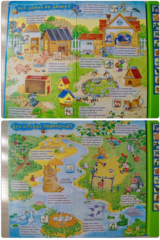 Каждый разворот посвящен отдельной тематике. И на эту же тематику написан небольшой и звучный стишок, чаще всего четверостишие. Например, на развороте "Чей домик во дворе?" в стихах рассказывается о жилищах различных животных: о поросятах в сарае, собаке в будке, кролике в клетке и т.п. И самое интересное - это после прочтения стихотворения найти на звуковой панели животного, о котором шла речь. Виталик не сразу начал понимать взаимосвязь, но когда понял, это стало любимой игрой :) иногда он слушает стихотворение и затем находит зверюшку на кнопке; иногда он сначала находит кнопку и требовательно просит читать именно про этого зверя :)