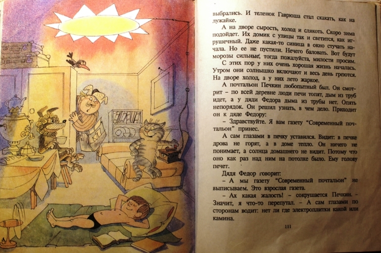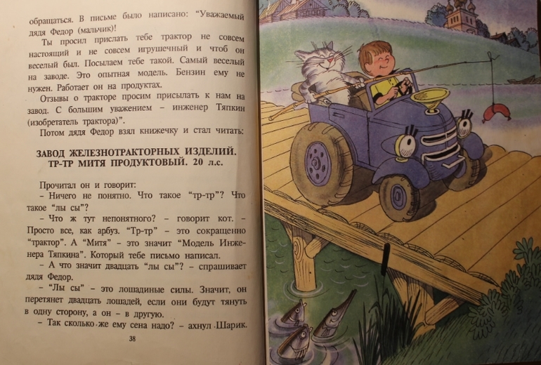 "Дядя Федор, пес и кот" одна из самых загадочных книг в моем понимании. Ну ничего же в ней нет, и перечитывая ее сейчас, я удивляюсь: все обаяние досталось мультфильму, все крылатые фразы, песни и сами герои. Чижиков нарисовал похоже, но все же не точь-в-точь. Но тем не менее. Я сама в детстве читала бесконечно эту книгу, перерисовывала картинки на стекле, мечтала подружиться с Дядей Федором. Недавно давала эту книгу сыну подруги, читали несколько раз, и дочка моя тоже много-много раз готова перечитывать эту историю. И каждый раз она расстраивается: " Ну почему родители все-таки приезжают за ним?" Когда читали год назад, на моменте приезда родителей расплакалась: "Все, они заберут его!заберут!" и читать дальше отказалась. Но пару месяцев назад достала книгу с полки и с тех пор регулярно вижу ее в руках. Сегодня вот тоже читала ,смеялась: А где моя мисочка на полу?)). На данный момент я нашла такую же книгу, но под другой обложкой от Лабиринта. Её и даю по ссылке. Моя же совсем старушка и время ее потрепало.