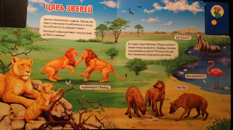 Сюда же отнесу говорящую книгу от Азбукварика "Чей дом саванна и пустыня". Бралась книга изначально младшей дочке, я искренне рассчитывала на миллион зверей внутри, ты на них нажимаешь ,а они рычат, мяукают и трубят. Но получила я что-то вроде энциклопедии (внимательно читайте отзывы перед покупкой!). Ева откровенно скучает и книгу игнорирует, зато Яна уже раз пятьдесят послушала, благо баритон начитывающего текст мужчины довольно приятный. Информации не много, больше рассказ в стиле, что вижу, то пою". К покупке не рекомендую, но и не отговариваю, книга у нас востребована, без дела не лежит. Я же буду смотреть другие серии этого производителя, т.к. все-таки хочу найти что-то для младшей.