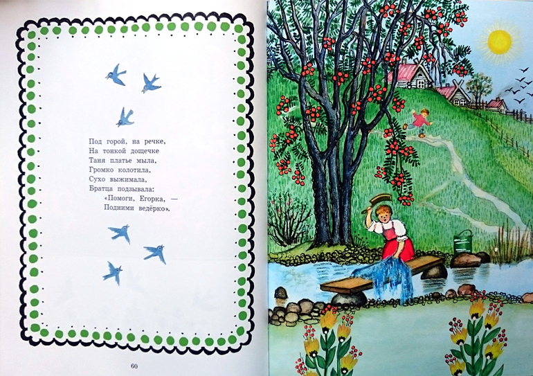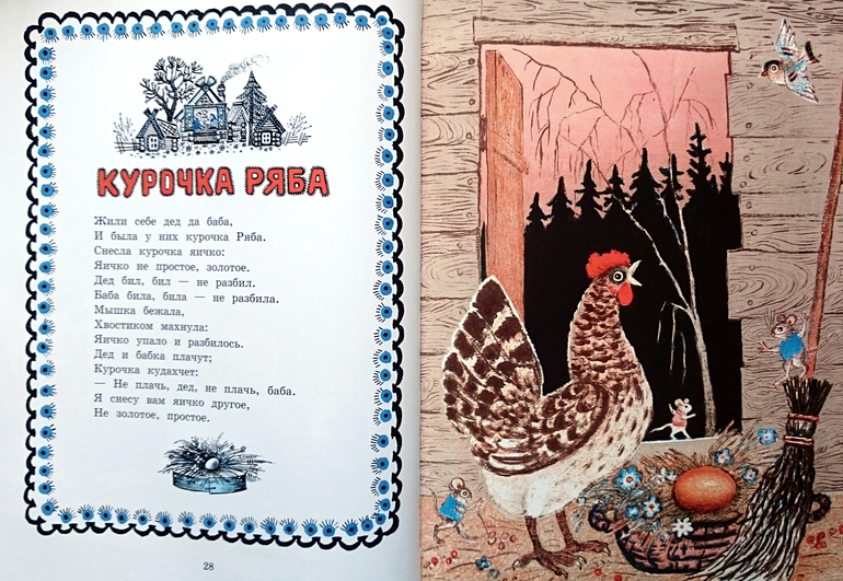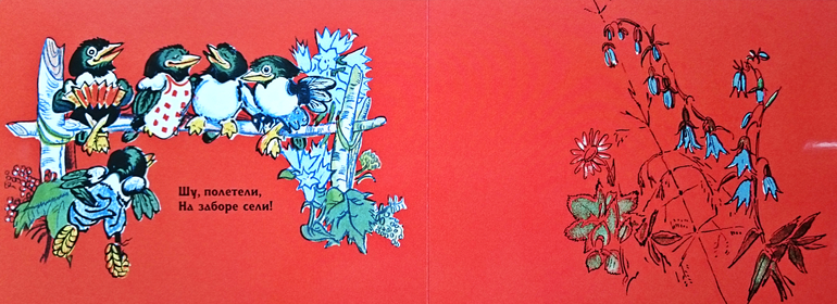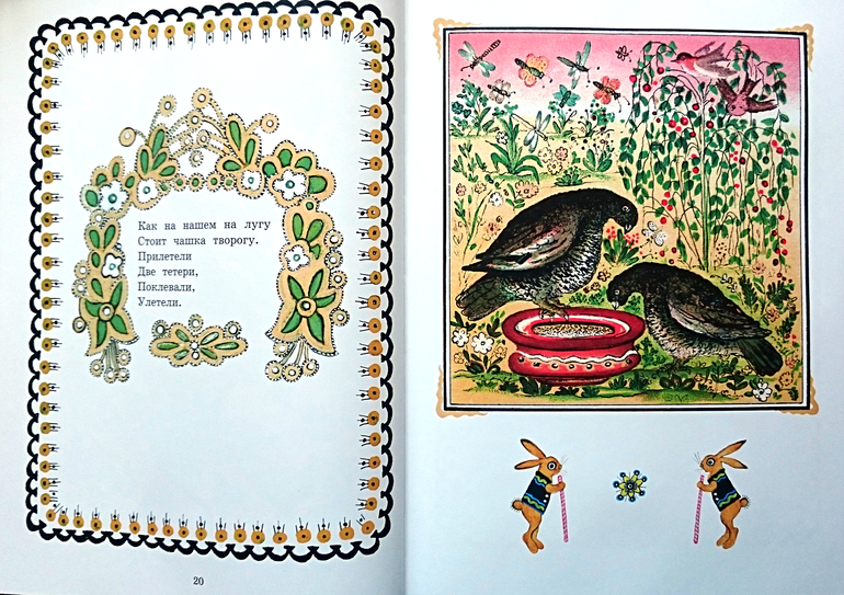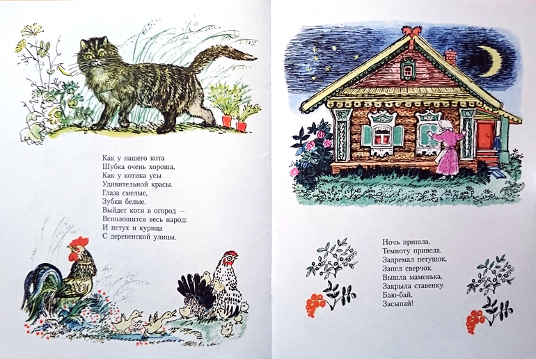 Почему потешки Васнецова так любят малыши, ведь, казалось бы, тут так много мелких деталей и такое обилие цвета?! Но вот как мне видится ответ: Ю. Васнецов в своих работах использует принципы обратной перспективы, где все предметы развернуты и обращены к зрителю, а не удаляются от него, как на картинах с правильной перспективой. Все предметы, животные, домики, шатры, цветы и орнаменты изображены в анфас и все их детали так же линейно*, а не скрыты в перспективе - ведь так рисуют и видят малыши! Образ для них полностью понятен и читаем)) Эта потешка Кисанька-мурысенька очень наглядно иллюстрирует все выше сказанное))
