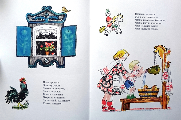 Привычные и хрестоматийные иллюстрации, будьте уверены тоже в должном колличестве имеются, их я просто не фотографировала, так как это все же обзор сборников потешек, а не отзыв на конкретную книгу - все, как бы не хотелось - не впихнуть((