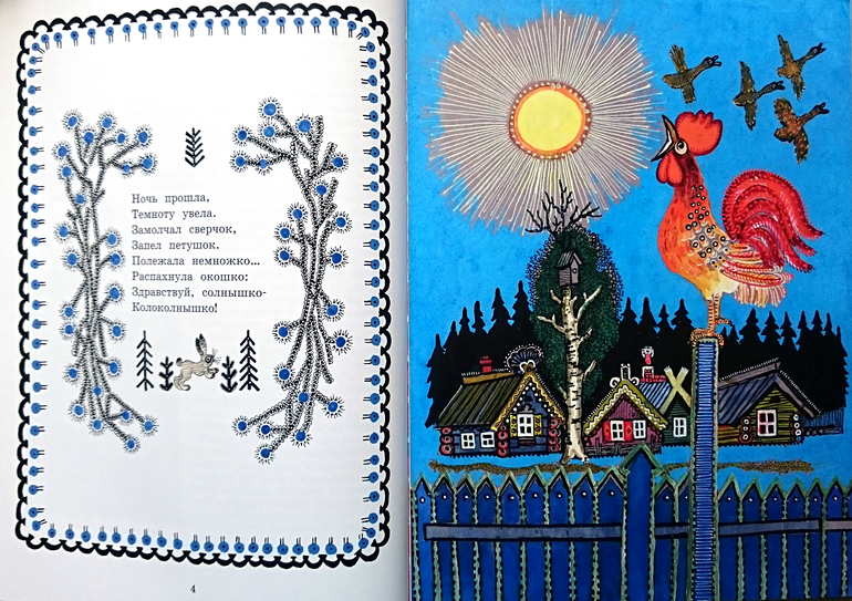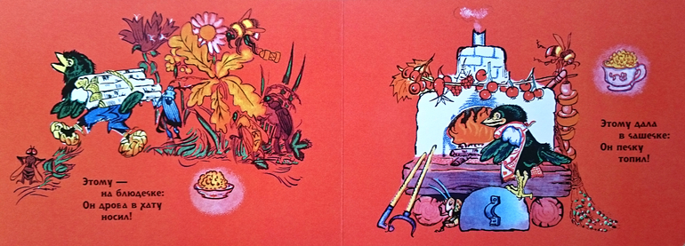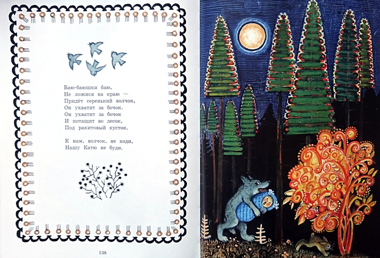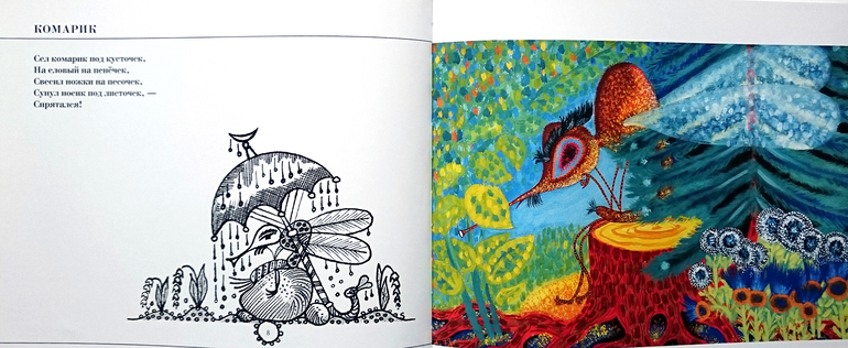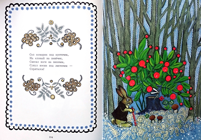 Потешка про комарика - тоже все отлично читается, всех видно и все узнаваемы, но в то же время это настоящая сказка - волшебный лес, украшенный орнаментом, куст с ягодами, горящий огнями)) А посмотрите как украшена лужайка (позем)!!!