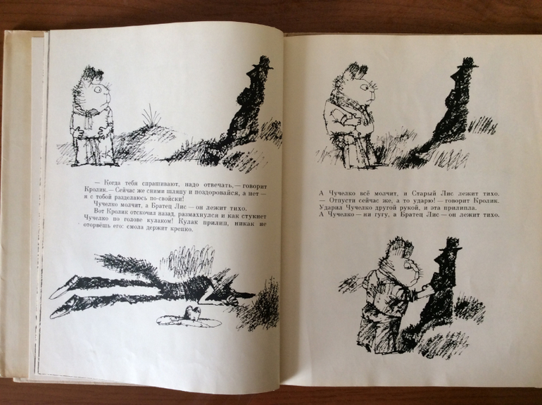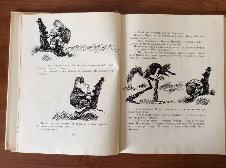В детстве мне казалось, что это безумно смешная книга. Когда начал читать детям, внезапно обнаружил, что сюжеты там ещё те - кому хвост оторвали, кого палкой поколотили, лис вообще свалился в кастрюлю с кипятком... Да и проделки зверей, мягко говоря, не безобидны. Но что интересно, дети тоже заливались хохотом слушая истории про Кролика и Братца Лиса. То ли у нас наследственно странное чувство юмора, то ли эта книга как то удивительно подходит именно детям, не обременённым взрослым занудством? Не знаю. Но книгу в нашей семье любят поголовно.