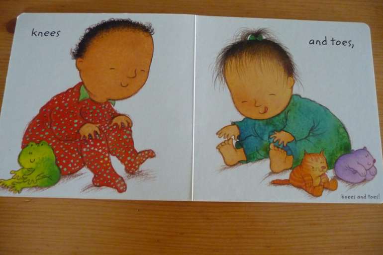 Книга про части тела с очень милыми картинками. Текст книги - это песня, о которой ребёнок узнаёт только в конце книги.