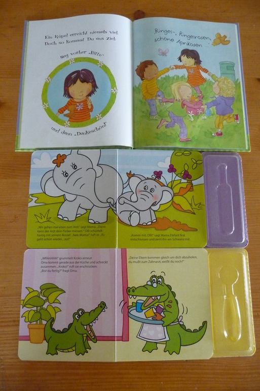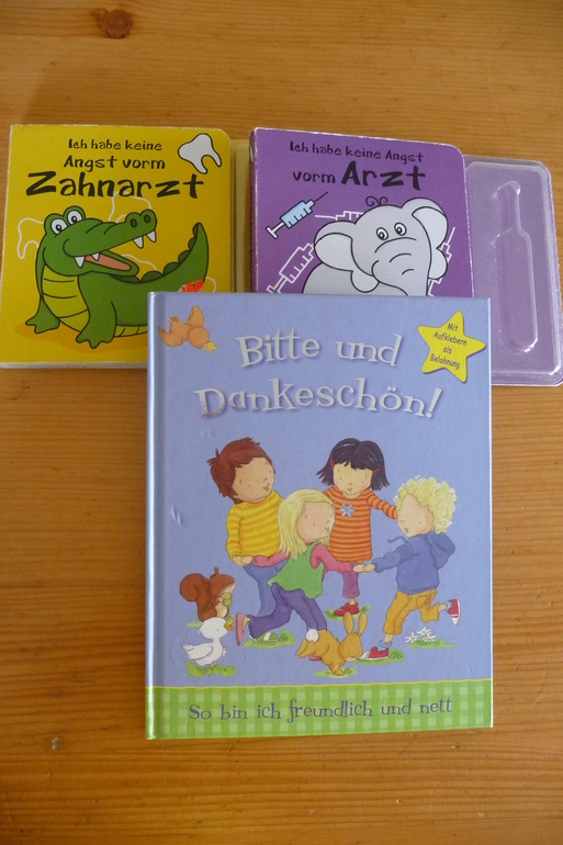 Начну с немецких книг. Две книжки с игрушками отхватили в КИКе по 10 центов каждая. Не купить не смогла и правильно сделала. Тексты простые, сюжет знакомый ребёнку, новой лексики не много, однако есть о чём поговорить и ввести новые слова в активный словарный запас. На основе сюжетов про врачей, играли в доктора и разбирались в узких специализациях)