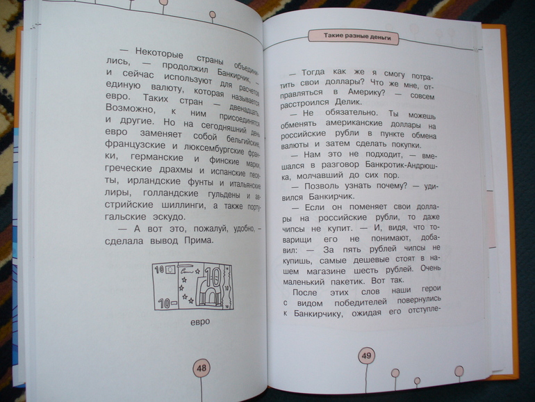 В Фикс-прайсе (от жадности) купила эту книгу. Прочитала. В целом мне понравилась) доступно, не нудно рассказано об основных моментах при создании своего дела. Конечно курс валют устарел, но само понятие обмен валюты, курс валют раскрыты. По ходу текста есть вставке с интересными фактами (самый долгоживущий бизнес-гостиничный.Японский отель работает с 705 года) и заданиями (придумай рекламное объявление для любого известного тебе бизнеса).