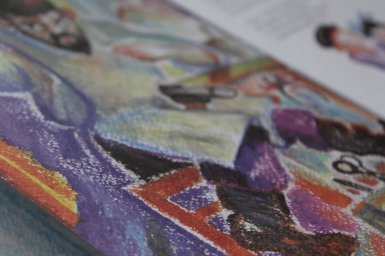 Рисунки пастелью удивительно гармонично сочетаются с плотным белоснежным офсетом, создавая эффект присутствия: кажется, что кто-то разрисовал свежеоштукатуренные стены разноцветными мелками, и ты,ненароком прислонившись, обнаружишь, что вся спина покрыта меловой пылью. Даже и сейчас, проводя ребром ладони по бумаге, словно ощущаю ее шероховатость и проверяю: не переснялось ли?