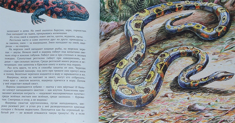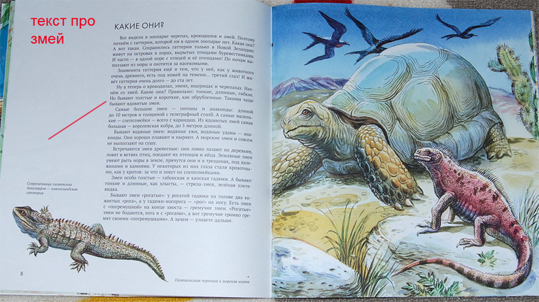 слева текст про змей, красной чертой указано то место, про питонов. На картинке черепаха ??? Про черепах на этой странице нет ничего.