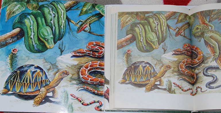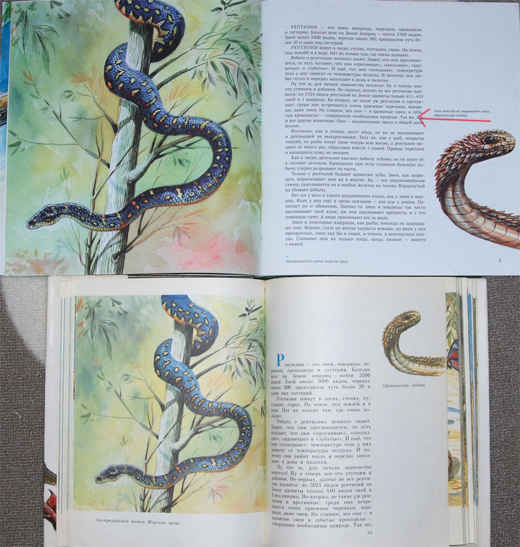 Если вы не уловили к чему я веду, поясню словами. В новых изданиях иллюстрации вставлены в произвольном порядке, не совпадающем с оригинальным изданием. В старом издании все рисунки на развороте имеют прямое отношение к тексту на странице. Если нарисован варан, так и в тексте рядом про варана. В свежем издании как нарочно почти все иллюстрации далеки от текста на странице. Читаешь одно, а смотришь другое. Это меня поразило при первом прочтении. Неужели художник просто рисовал альбом "на тему"? Что побудило достать старый сборник и провести это сравнение. Ребенку, который еще не очень хорошо ориентируется в терминах: кто такой варан, хамелеон, как выглядит питон - на мой взгляд важно, чтобы иллюстрации имели прямое отношение к тексту. Да и мне было несколько некомфортно, ибо не понимаешь - почему так сделано. А потому что дизайн (с)