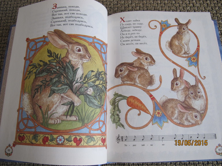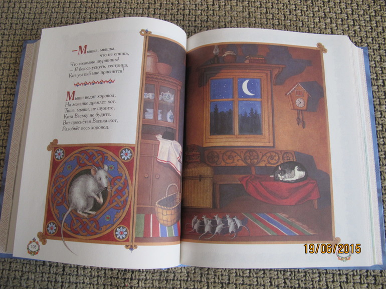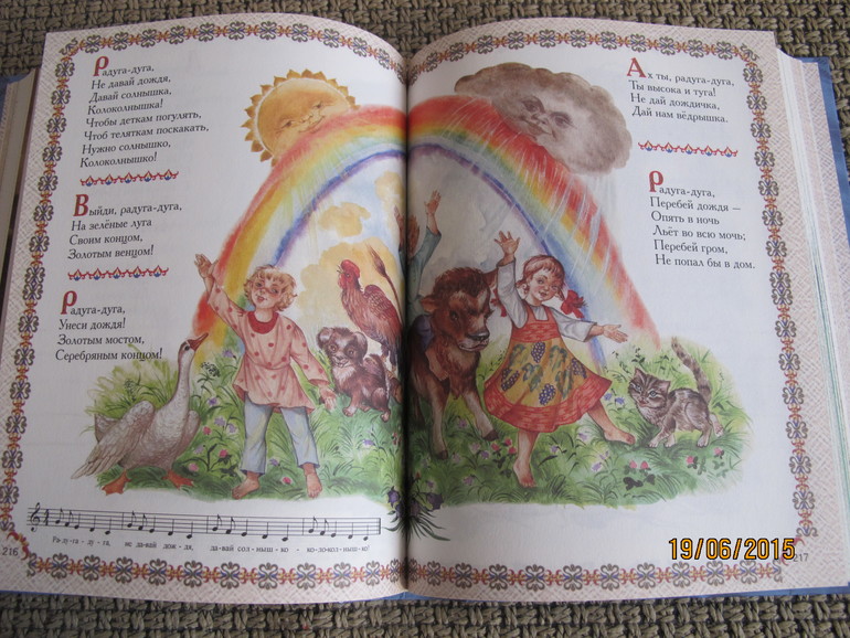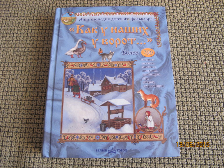 Энциклопедия детского фольклора "Как у наших у ворот". Любим мы с девчонками фольклор, мимо этой книги я пройти не смогла.))) Иллюстрации понравились, правда, из-за того, что книга толстая, у иллюстраций на весь разворот не видносередину. Бумага шероховатая. Но в общем всё устраивает, потешек многих не слышали. Есть даже ноты для песенок.)))