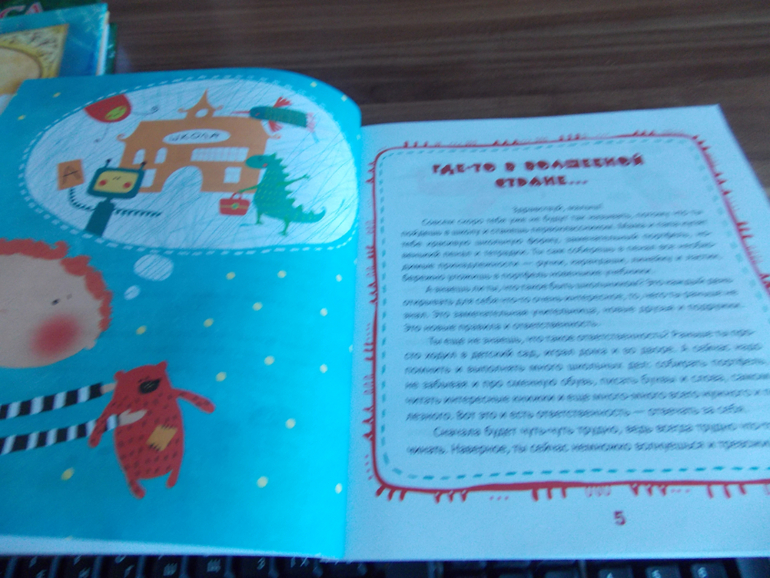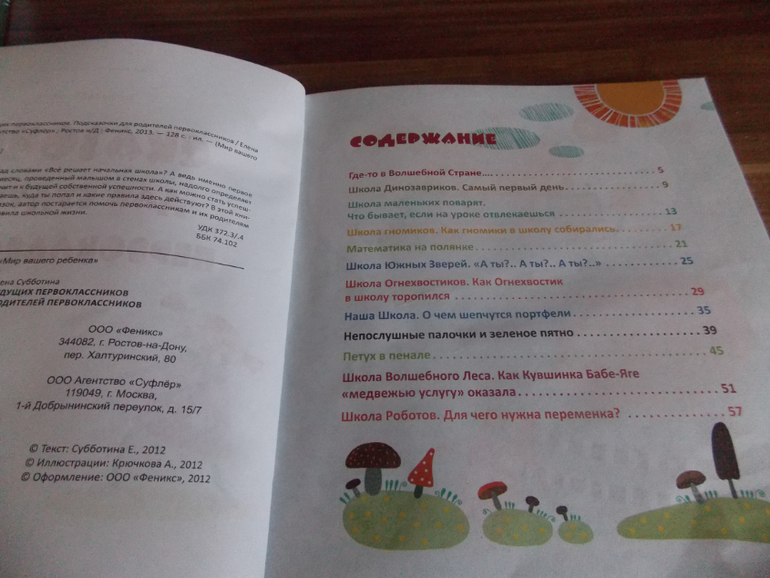 Эта книга двухсторонняя, одна сторона - подсказочки для родителей, с другой - сказочки для первоклассников. Содержание для родителей: Вступление., Школа. Урок., Перемена. Каникулы, После школы вместе, После школы один дома, Домашнее задание,Собираем портфель, словарь нежеланных выражений, заключение. Очень понравилось вчера прочитала сразу же, вставлены высказывания детей о школе, много толковых советов и примеров из жизни, которые взяла на заметку. А с Ксюшей прочитали первые сказки, сразу после сказок есть вопросы для ребенка, чтоб он провел аналог между сказкой и настоящим.