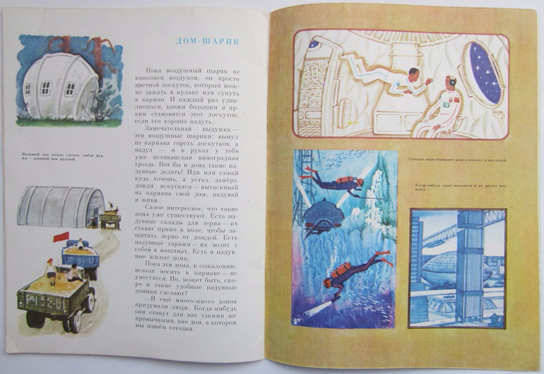 Больше внимания форме дома.Интересная глава о жилищах Средней Азии. Есть также о переносных домах и бумажных. Есть истории о "Доме-цветке", "Доме на курьих ножках", "Доме на сваях".Последний раздел "Завтра" посвящён идеям, которые приходили в головы архитекторам 80-х. Не все из них осуществились уже сейчас, но многие)