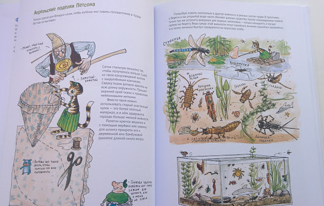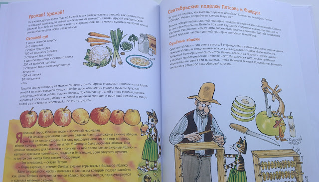 А это уже не истории! Это книга, в которой под каждый месяц года собраны поделки, идеи, вдохновения, описание природных явлений, рецепты пирогов и супов... И все это с прекрасными иллюстрациями Свена Нурдквиста и небольшими историями про старика и котика.Идей там масса и все настолько разнообразные, что, пожалуй, из книги невозможно вырасти. Трехлетке вы скажете: "А давай испечем пирог, как у Финдуса?" и позволите ему сыпать муку, или удивите его лодочкой из листика.