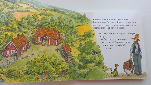 По идее она подойдет для первого знакомства с котиком и старикашкой, но у нас она появилась позже, то есть начали мы с обычных книг. Не помню точно, когда, но вообще я брала с собой в отпуск Финдуса в прошлом году, значит, Влад познакомился с ним где-то в районе двух лет.
