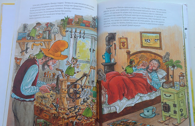 А еще (у нас пока нет такой книжки, но я слушала аудиопостановку) - "Охота на лис" - прямо очень смешная. История о том, как к Петсону и Финдусу повадилась ходить лиса, и те решили ее прогнать, чтобы она не своровала кур. Но в то же время, они не хотели в нее стрелять, как сосед, поээээтому они придумали... Ну, в общем, ее тоже советую! А так еще есть "Механический дед Мороз", "Переполох в огороде", "Рождество в домике", книга с рецептами - серия действительно большая! В Швеции это настоящая классика, есть и сувениры, и мультики, и игрушки, спектакли...