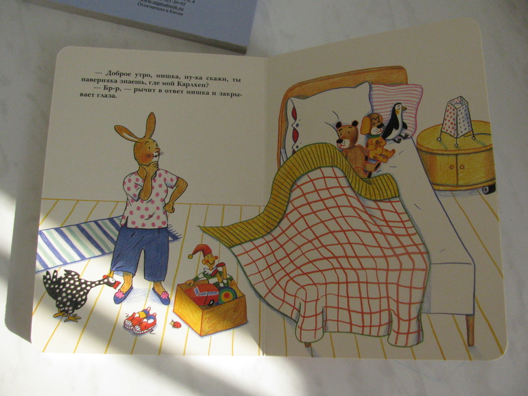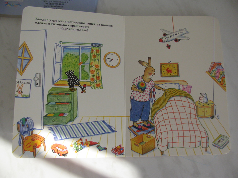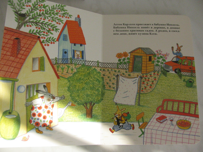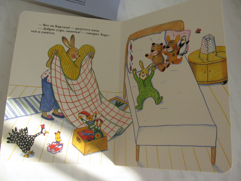 Дальше следует знаменитый Карлхен. Я взяла на пробу 2 картонки и Выбрала эти истории т.к. и мой сынок любит прятаться под все одеяла и простынки, занавески и углы - любит прятки. Вот эти две книжечки были нашими мега-хитами, я читала их по 6-7 раз подряд, а иногда и 10. Сначала огромную любовь вызывал рассказ про утро Карлхена, а потом началась любовь к Карлхену который прятался от Бабушки. С этими картонками ребенок ходил за мной повсюду и требовал читать, весь день мы читали про Карлхена. Потом ажиотаж немного утих, но и сейчас мы читаем эти истории каждый день. Думаю этих двух книжек вполне хватит, надобности во всей коллекции нету, может когда Миша подрастет, купим бумажные истории про зайца. Имя у него конечно своеобразное и сложно произносимое, но я быстро привыкла, а поначалу язык ломала. Иллюстрации Бернер конечно замечательные, чуть позже мы будем пользоваться книжками и как мини-виммельбухами, они прекрасно подходят и для этих целей.