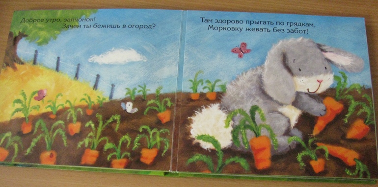 Еще одна книга подсмотренная в сообществе Нам очень понравилась эта книжечка, приятные взору,мягкие по тональности, простые, лаконичные, детские картинки, ничего лишнего. Стишки простенькие, но несут в себе потенциал для развития речи-все эти повторяющиеся тук-тук, кап-кап, ту-ту, мяу и гав, включенные в стишок. Ребенок слушает с большим удовольствием, несколько раз подряд. Пока что не заговорил, но я жду терпеливо и читаю, читаю, говорю, говорю...