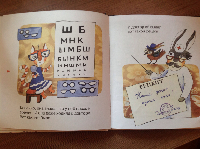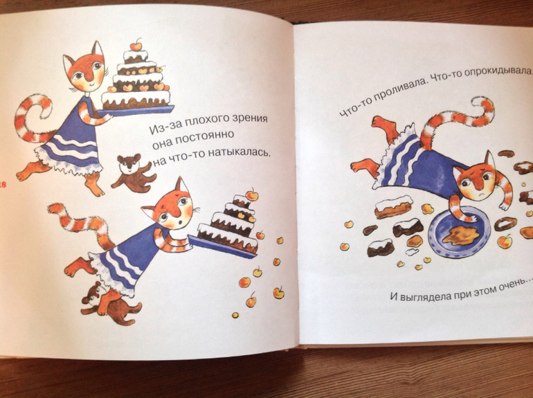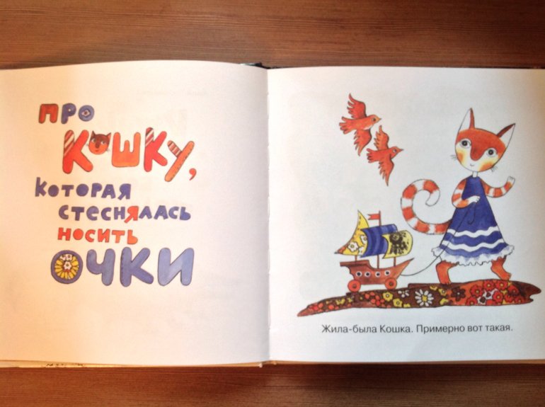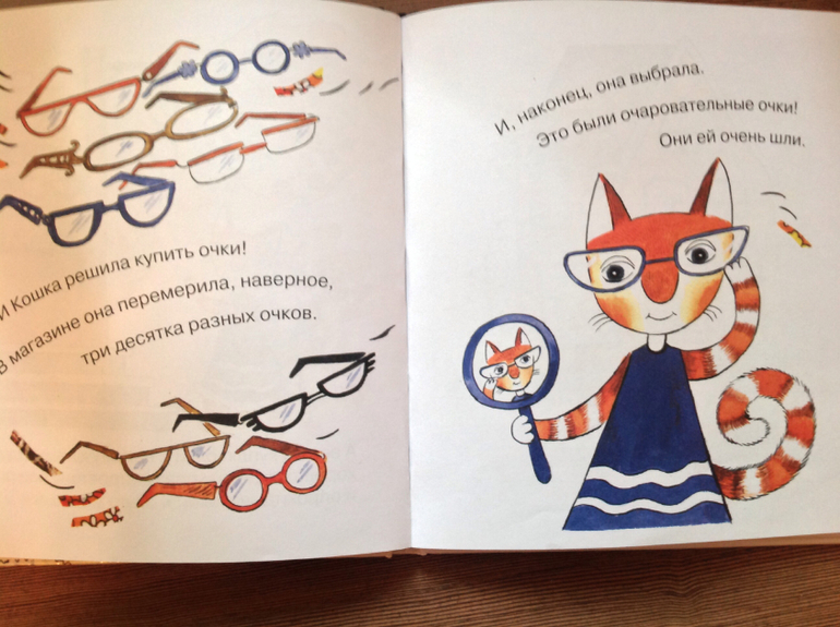 В книге две истории о кошке. В первой кошка побеждает свой комплекс по поводу ношения очков, а во второй - свой страх темноты. Как терапевтические сказки, очень даже ничего!