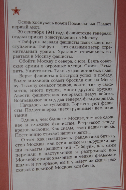 Купила две книги из серии "Великие битвы Великой отечественной". Всего 6 книг в серии, я приобрела первую и последнюю)) Посмотрела, почитала, буду брать все. Хороший, белый офест, шрифт покрупнее обычного. Рассказы маленькие, но очень информативные. Нет душераздирающих моментов, но от рассказов бегут мурашки. Моё мнение, что книга подойдёт деткам от 7 лет до 12.