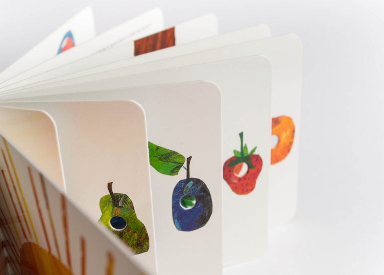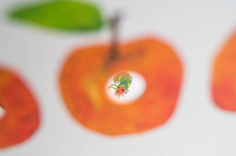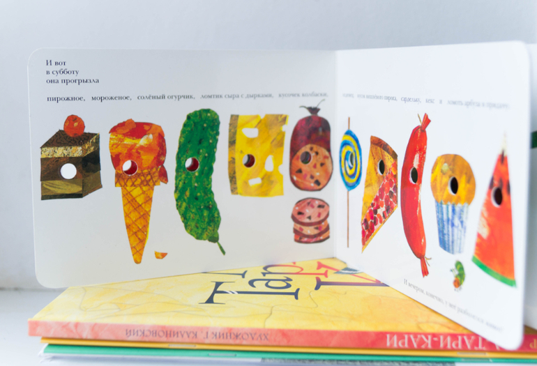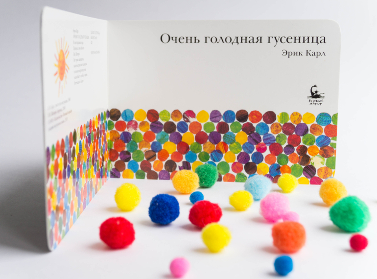 Книга вроде бы самая известная, но я умудрилась купить её в последнюю очередь. Однако ж какова, чертовка. Зацепила с форзаца. Алиска считает, что эти кружочки - шарики из сухого бассейна, что в игровых комнатах. Поэтому первое время эта книга была у нас не про гусеницу, а про шарики.